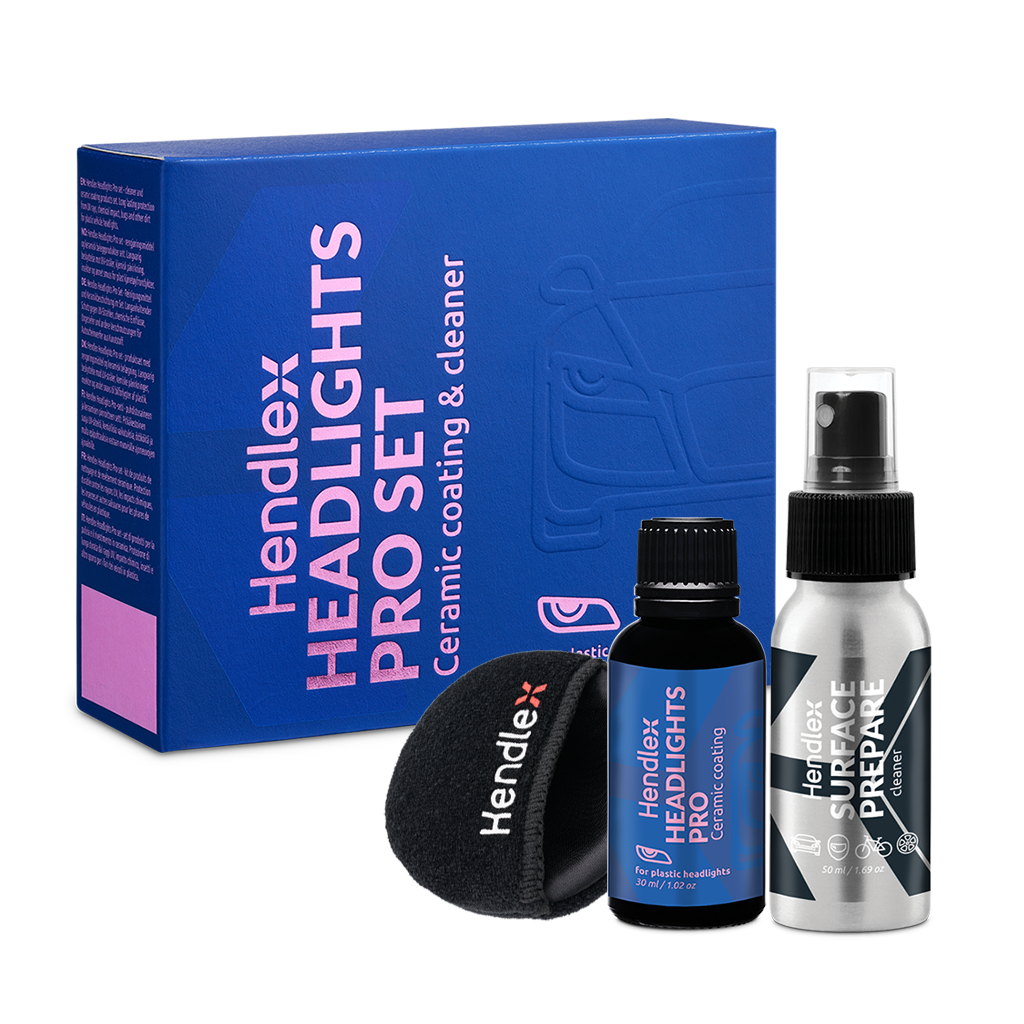 Hendlex Headlights Pro protection set is designed to be used on plastic vehicle headlights. Included cleaner helps ensure proper surface preparation for ceramic coating application and a nano ceramic coating protects vehicle headlights. The ceramic coating are highly hydrophobic and gives strong protection from UV rays and chemical impact for the surface. Gives it a glossy shine, prevents dirt and other contaminants from sticking to the surface, it means vehicle headlights become easier to clean and requires less maintenance. Also Hendlex Headlights Pro ceramic coating protects the vehicle headlights from adverse environmental impacts, such as acids, alkalis and road salts.