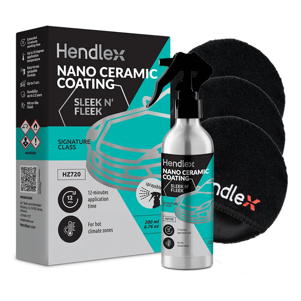 Hendlex SLEEK N‘ FLEEK is an innovative ceramic coating designed to transform the application experience, offering a high-performance solution that eliminates the typical rush and heat-related challenges. Unlike conventional coatings, its advanced, sprayable formula provides an extended 12-minute working window after application before polishing, allowing for a relaxed and precise process even in warmer conditions. This not only enhances user comfort but also ensures a flawless finish. Beyond its user-friendly nature, Hendlex SLEEK N‘ FLEEK delivers exceptional durability, protecting automotive paint, rims, and plastic or metal trims for up to 2.5 years with outstanding hydrophobic properties, strong chemical resistance, and an impressive, deep, reflective shine.